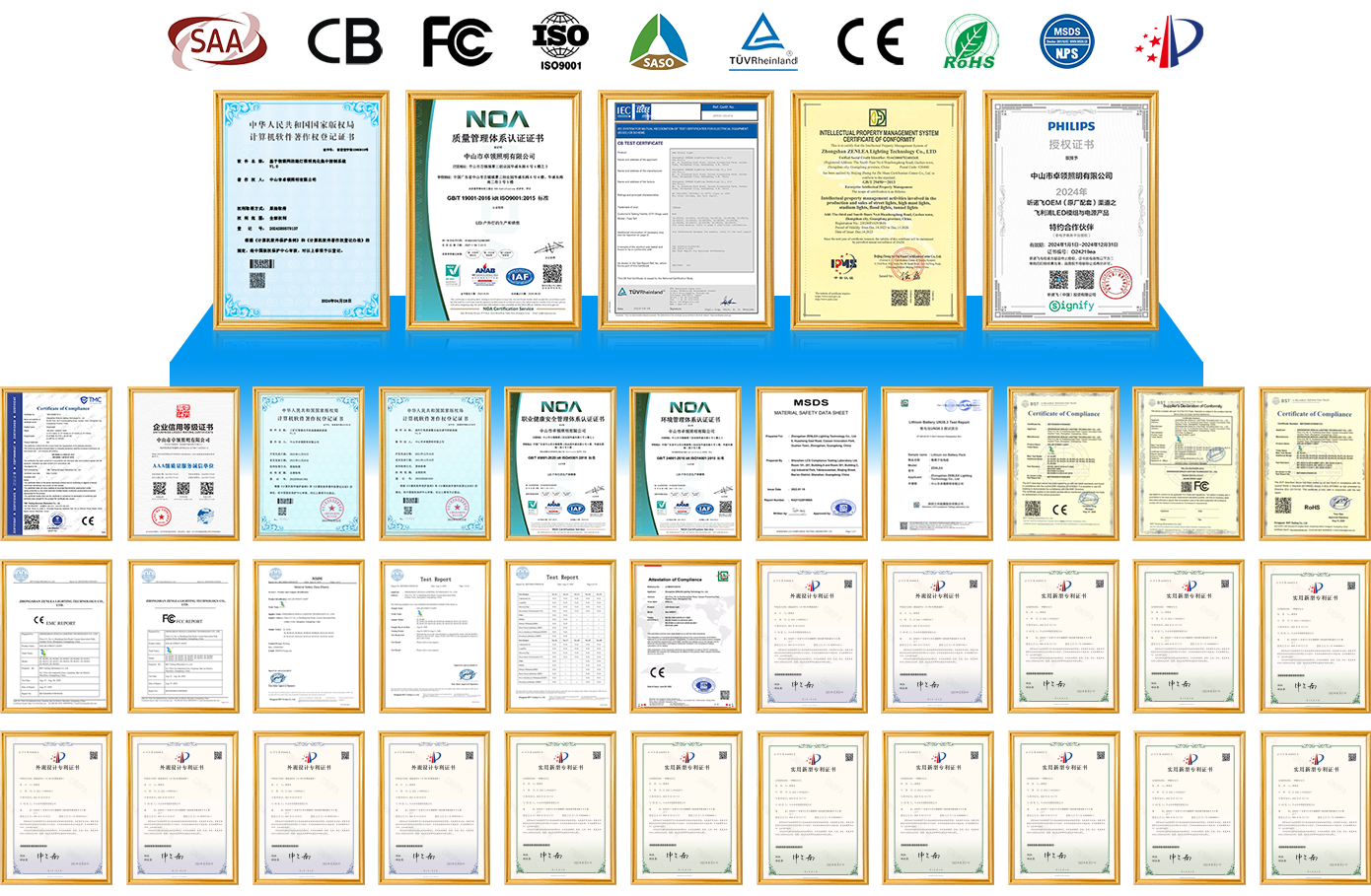 Zenlea Lighting has passed the ISO9001/ISO14001/OHSAS45001 management system and has advanced die-casting workshops, lamp testing, light distribution, aging equipment, testing laboratories, etc. Our products have obtained more than 116 certifications, including quality audit certification and testing by authoritative departments such as CE, CB, RoHS, FCC, TUV, Bureau Veritas, RWE, etc.